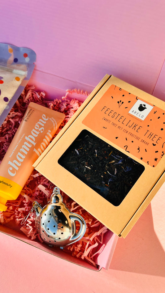 Feestelijke Cadeaubox – Prosecco Gummies, Thee & Luxe Accessoires