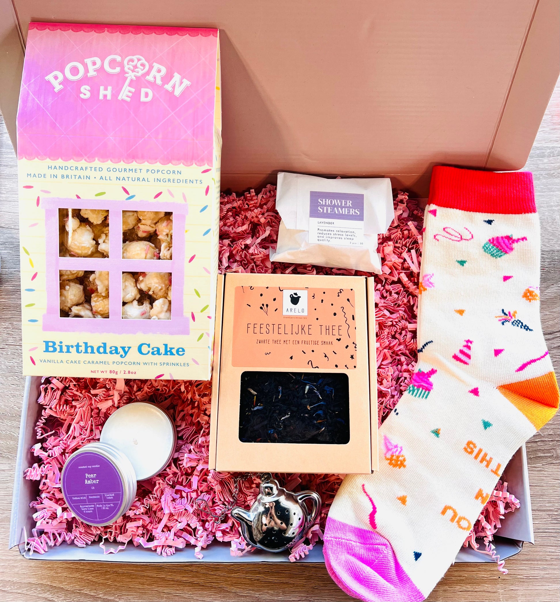 Een feestelijk en luxe cadeau om een verjaardag extra bijzonder te maken. Deze box combineert gezelligheid, ontspanning en een vleugje verwennerij – ideaal om waardering en felicitatie in stijl over te brengen.