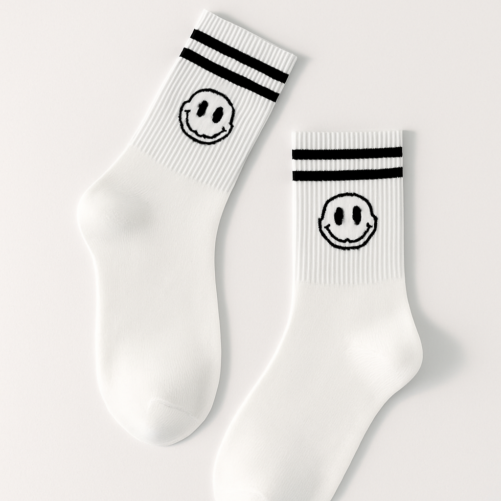 Zeg het met een smile! Deze witte crew sokken met dubbele rode strepen en een vrolijke (lekker eigenwijze) smiley geven elke outfit een speelse twist.