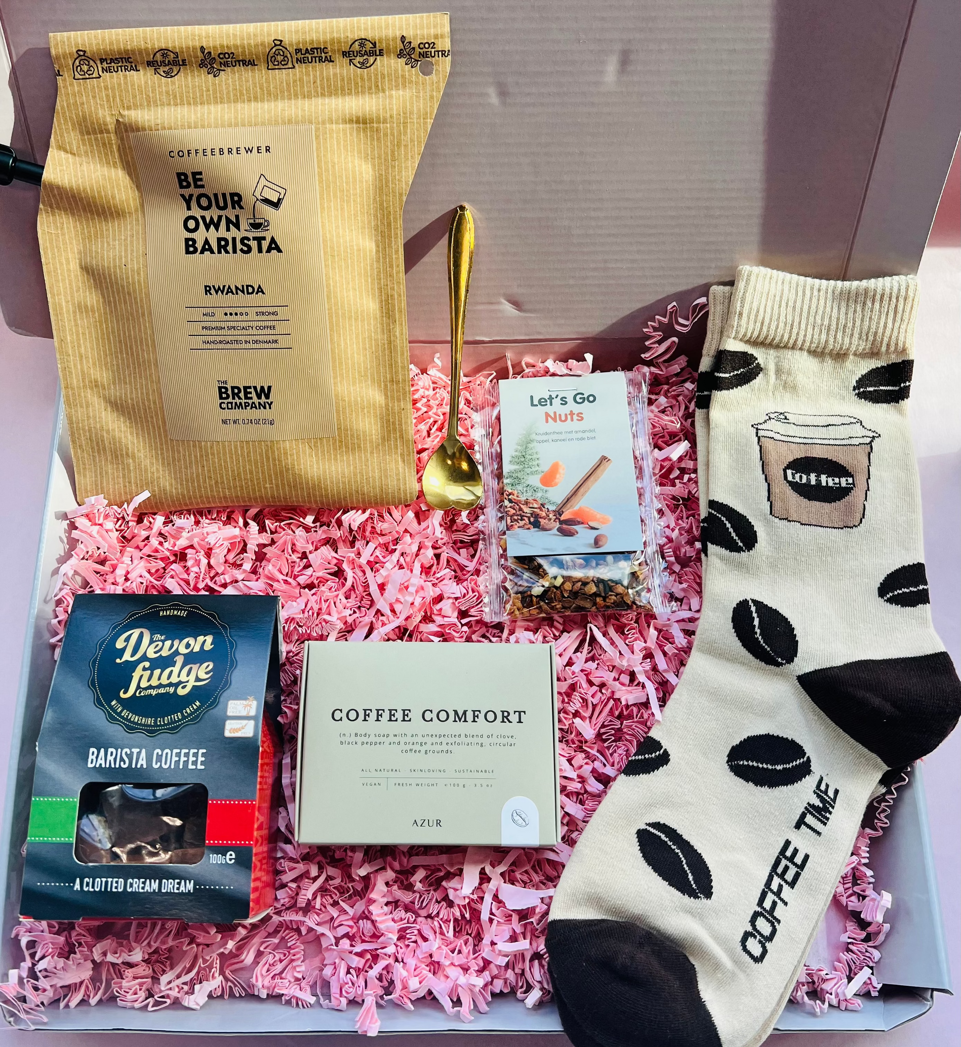 Geef jezelf of een ander een heerlijk verwenmoment cadeau met dit luxe pakket vol koffiecomfort. Perfect om even te ontspannen, te genieten en een glimlach te toveren.