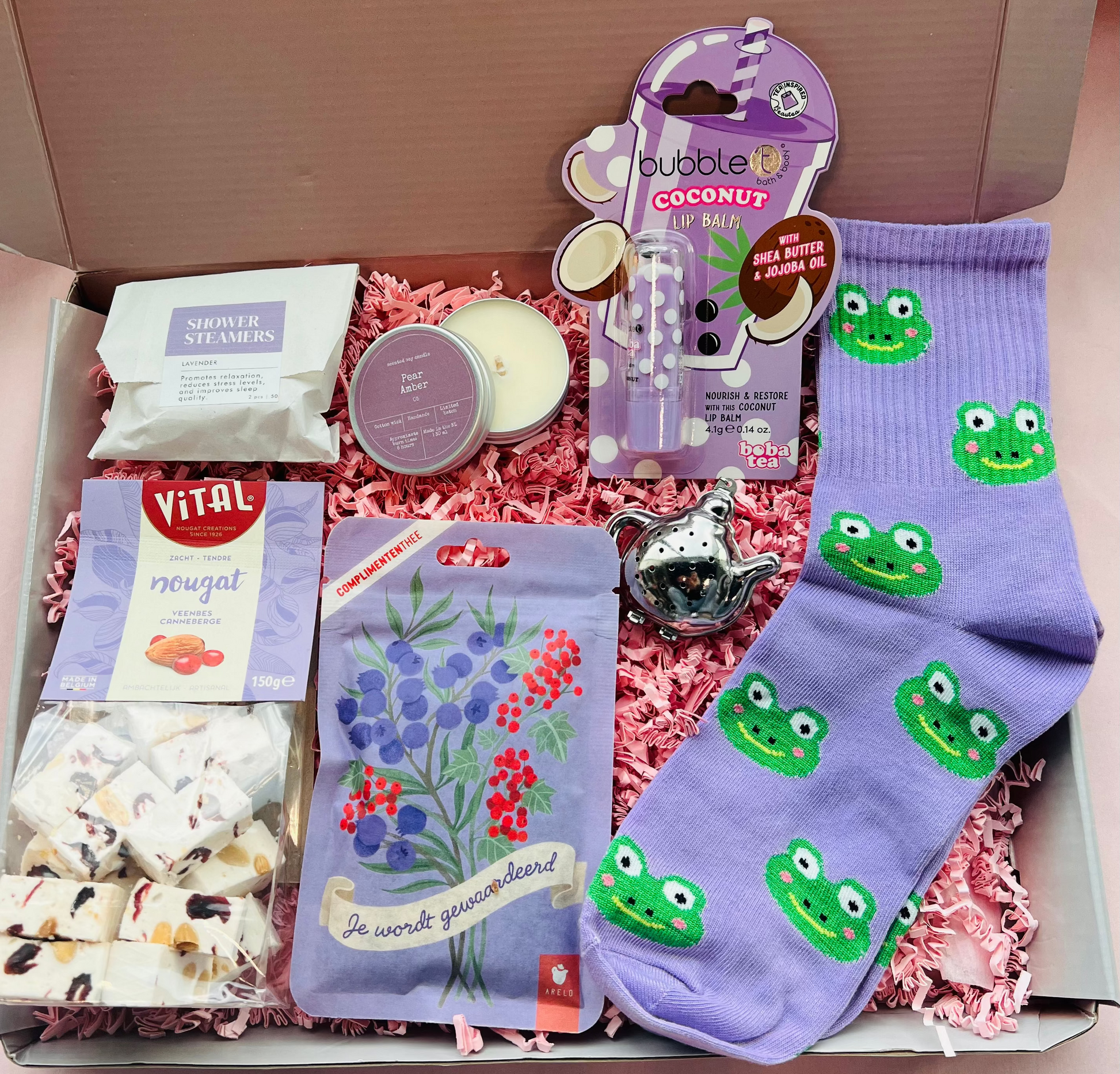 Verras iemand met een warme opkikker! Deze luxe cadeaubox in stijlvolle paarse tinten is gevuld met vrolijke, ontspannende en smaakvolle producten. Perfect om iemand te laten weten dat ze gewaardeerd worden of gewoon om een glimlach te bezorgen.